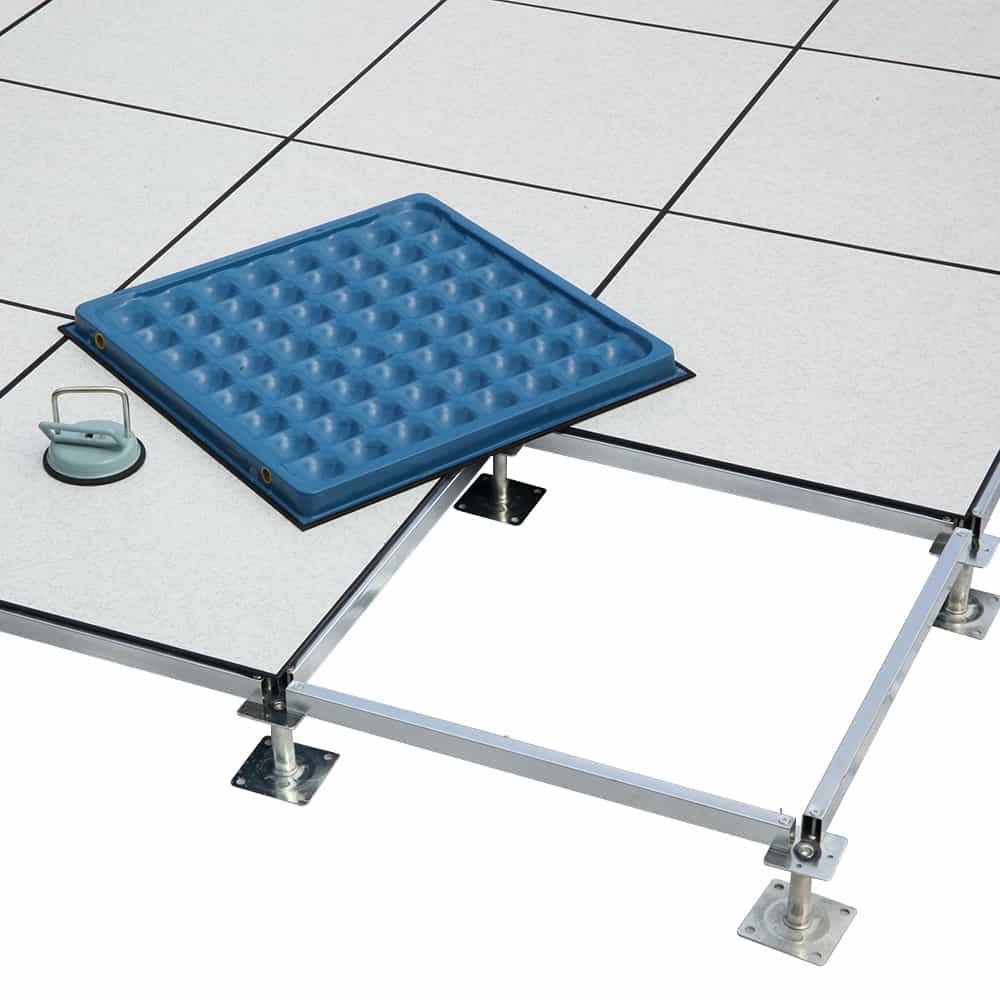 全鋼防靜電地板為全鋼組件,分有邊、無邊、微邊(三種邊處理方式)。底面采用SPCC深沖冷軋板拉伸成型鋼板厚度(0.4~1.5mm),球窩狀結構,增加地板的機械荷載強度。面板采用硬質SPCC鋼板(0.5~2.0mm),上下經過點焊焊接成型,切邊沖孔后,經防銹處理,環氧樹脂粉末靜電噴涂后,中間填充發泡水泥(可以根據客戶需求發泡不同重量),再經過日曬養護后形成穩定的承載結構。地板上表層粘貼防火板(HPL)/復合PVC/ 通體PVC/陶瓷地磚等不同材質的裝飾表層,達到產品花色的多樣性、可以根據客戶需求個性化定制產品。搭配聯網支架、支架、螺釘組裝后,定位聯接更加準確、精度可靠。