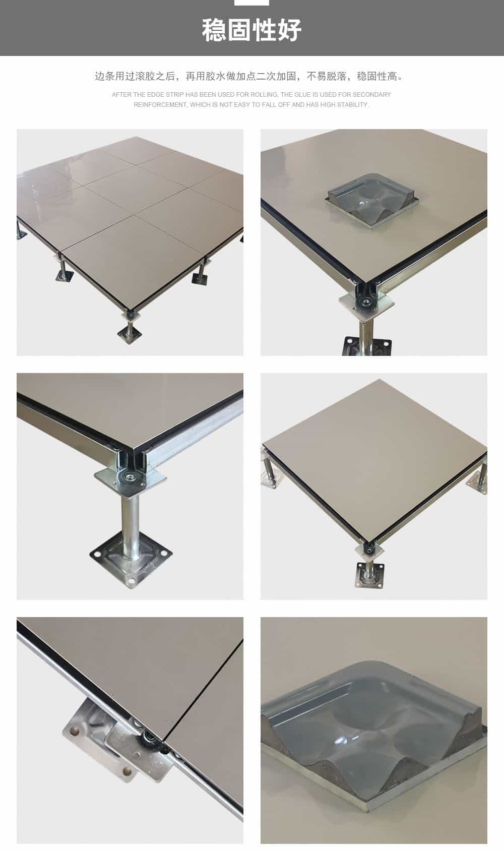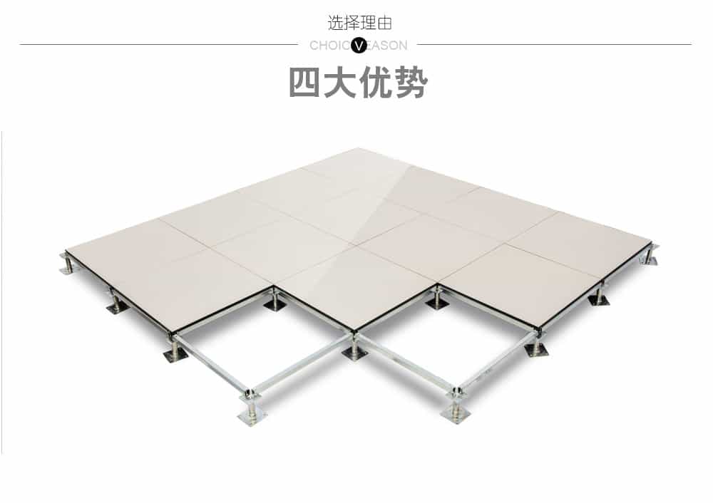全鋼陶瓷防靜電地板采用上海寶鋼合金冷軋鋼板,經拉伸后點焊成形。在瓷質面層的生產過程中,均勻注入防靜電添加劑,由于面層的耐磨性,防靜電性能可以保持20年以上。而且系統電阻穩定、經信息產業部防靜電協會檢測,各項性能均達到要求。全鋼陶瓷防靜電地板系統有地板、橫梁、支座組成。橫梁和自身高度可調的支座用螺釘連結成穩固的下部支承系統,地板鑲嵌入橫梁圍成的方格內。