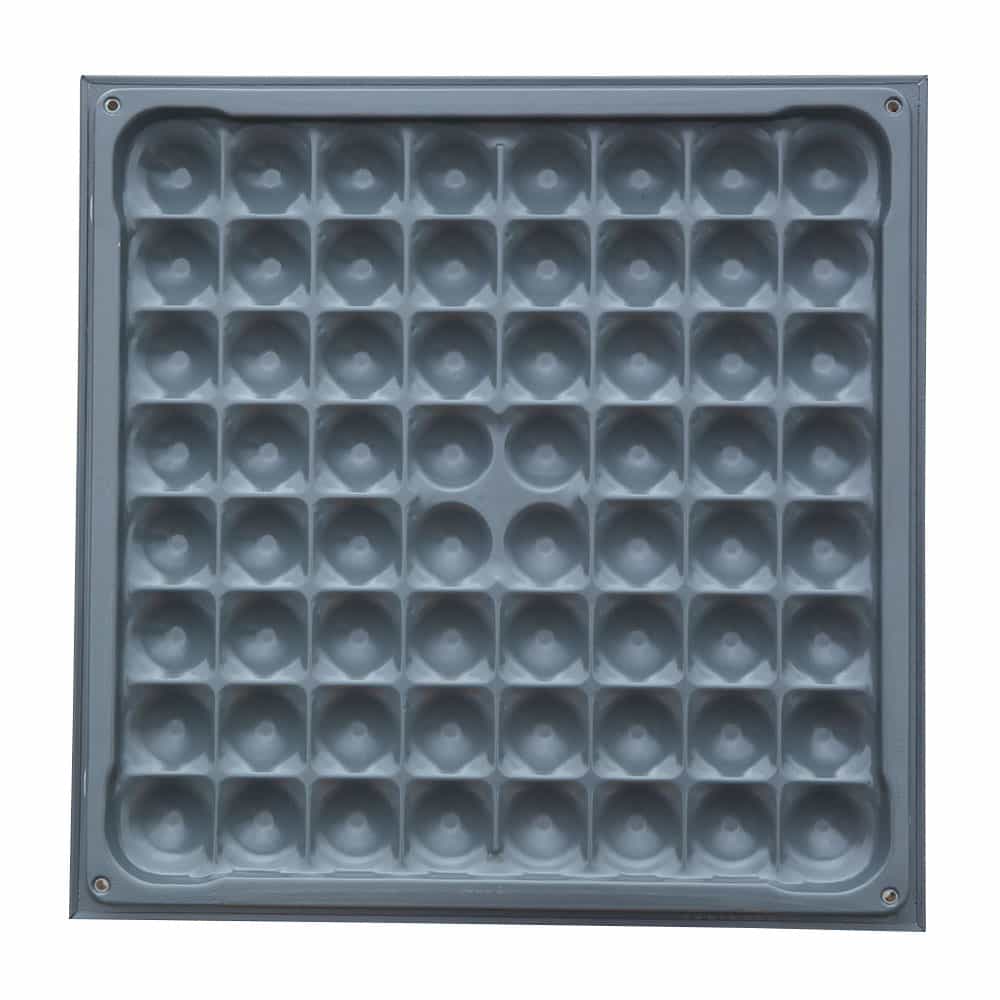 OA600網絡架空地板采用鋼板經拉伸成型、點焊、外表經防銹處理后進行靜電粉末噴涂處理,內腔填充發泡水泥,四角帶有角鎖孔。支架為冷軋帶鋼鋼板及鑄鋁合金鋁頭組成,可調節升降高度。由于智能化樓宇配線復雜,功能齊全,故出線口較多。