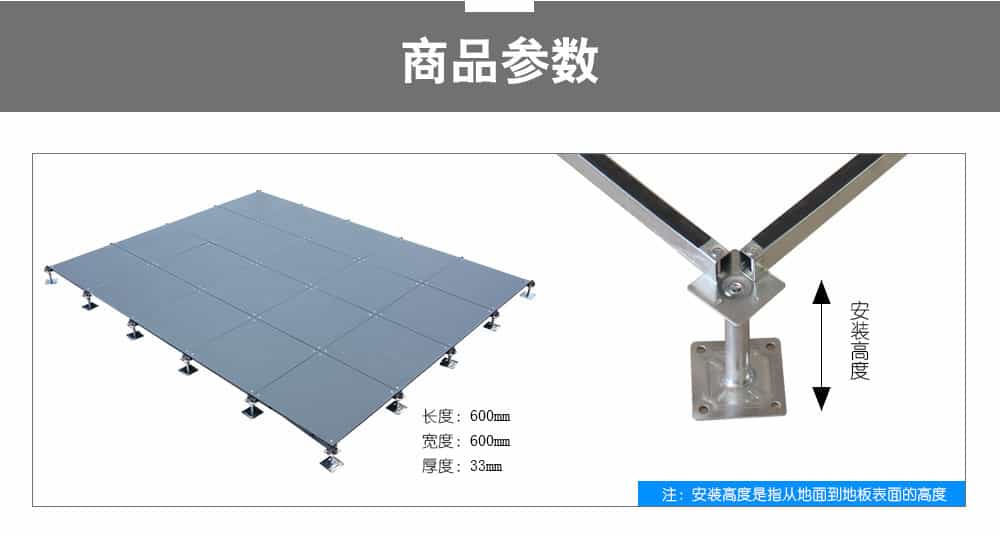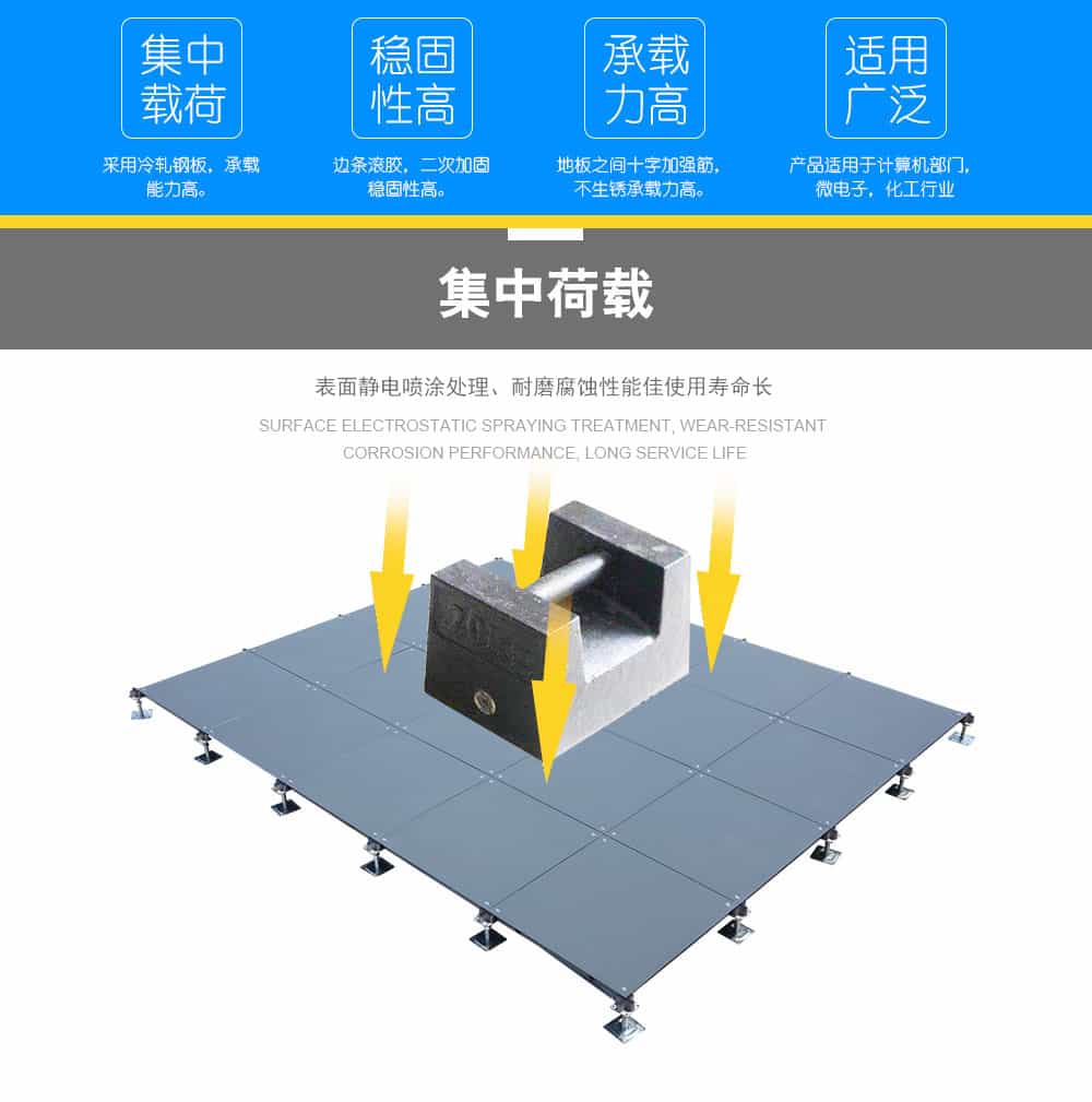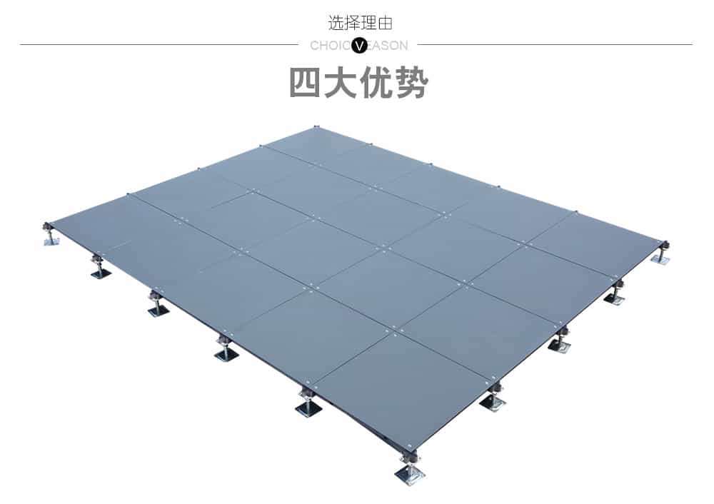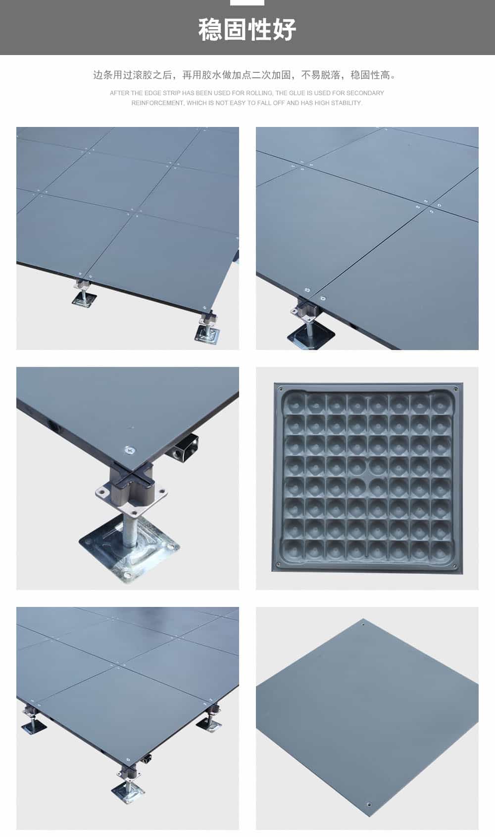 該地板可以選配帶出線口的配置,可根據要求任意添加線槽布線更具靈活性。此地板可以將強、弱電分開隔離,同時也便于檢修。安裝采用無梁角鎖,具有牢靠、穩定、調平、簡便之特點。